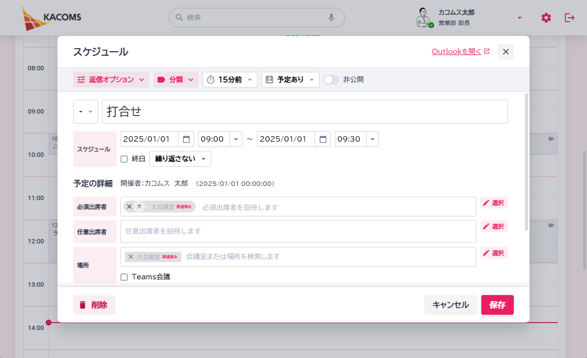 表示されているスケジュールをクリックすると、編集ダイアログを開きます。
