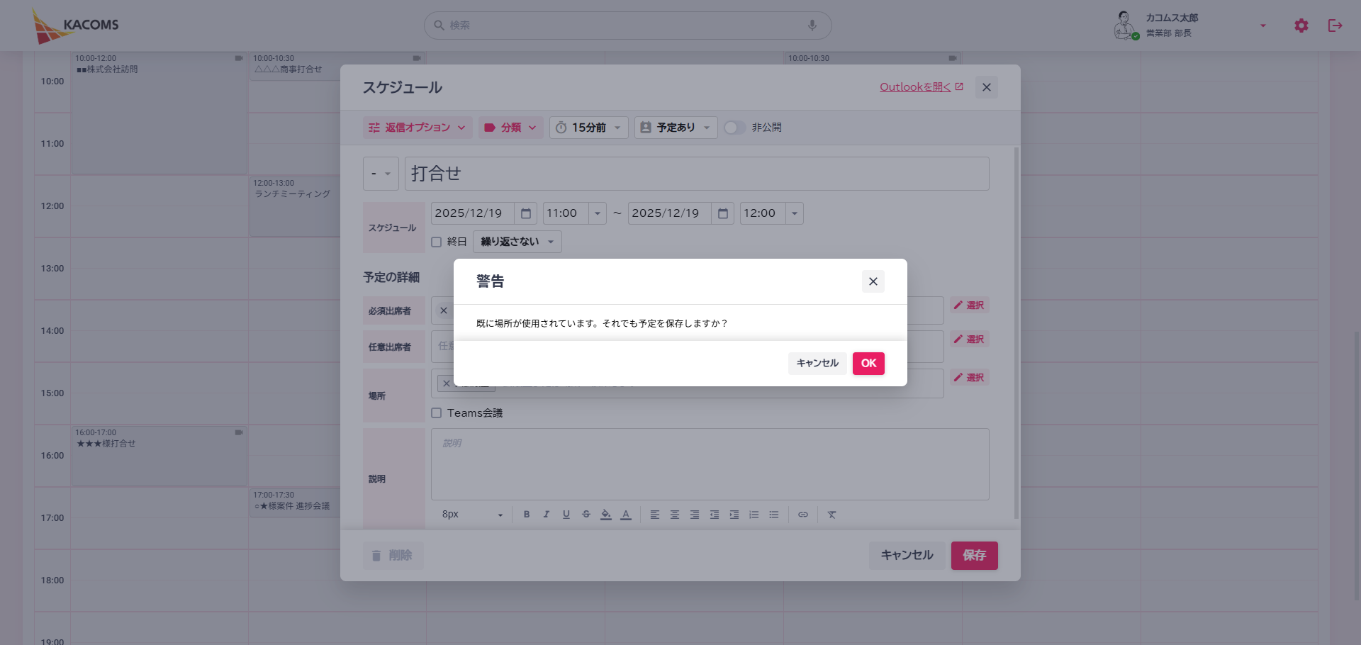 会議室が登録されたスケジュールを保存する際、会議室側で予定が重複していると警告ダイアログが開きます。